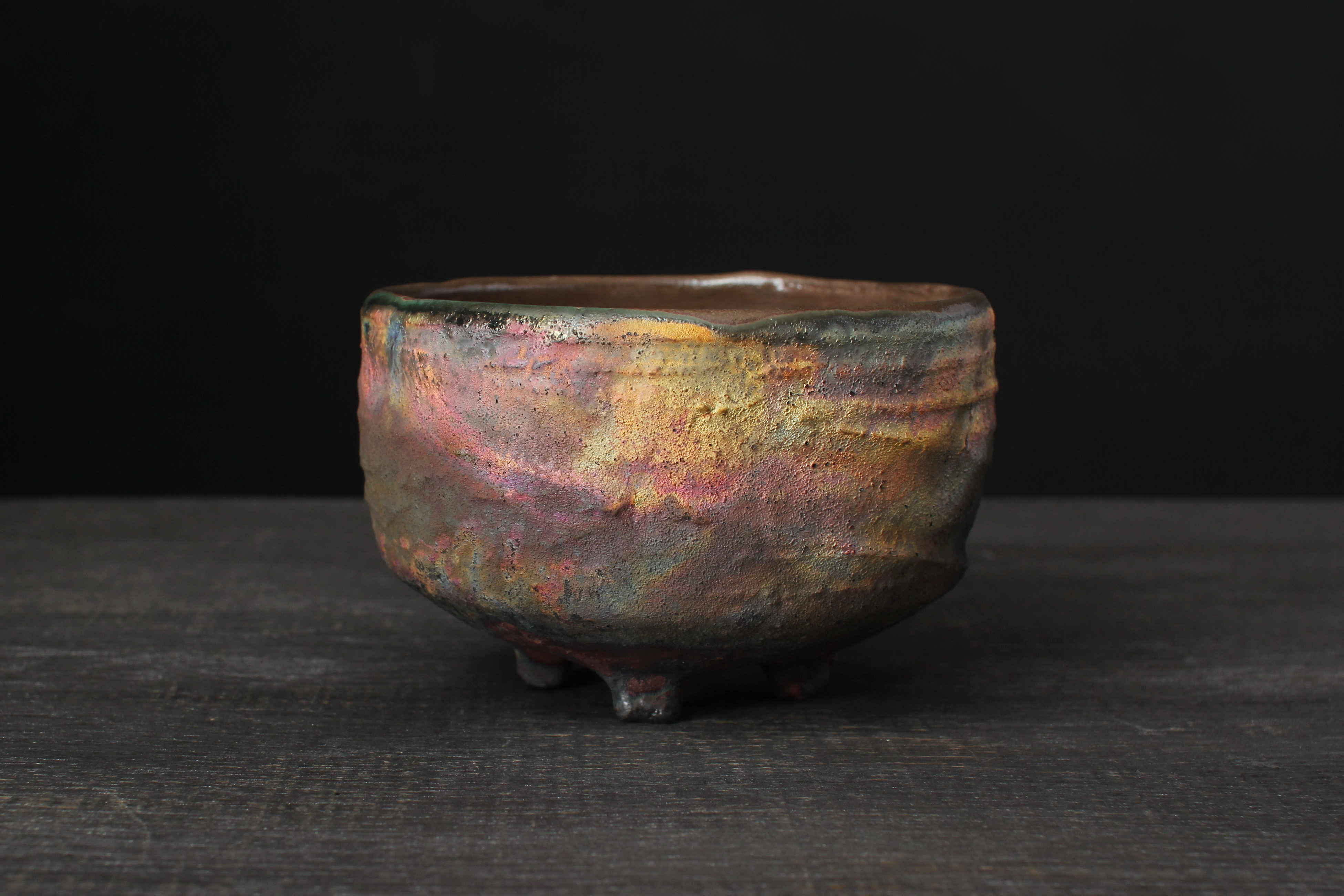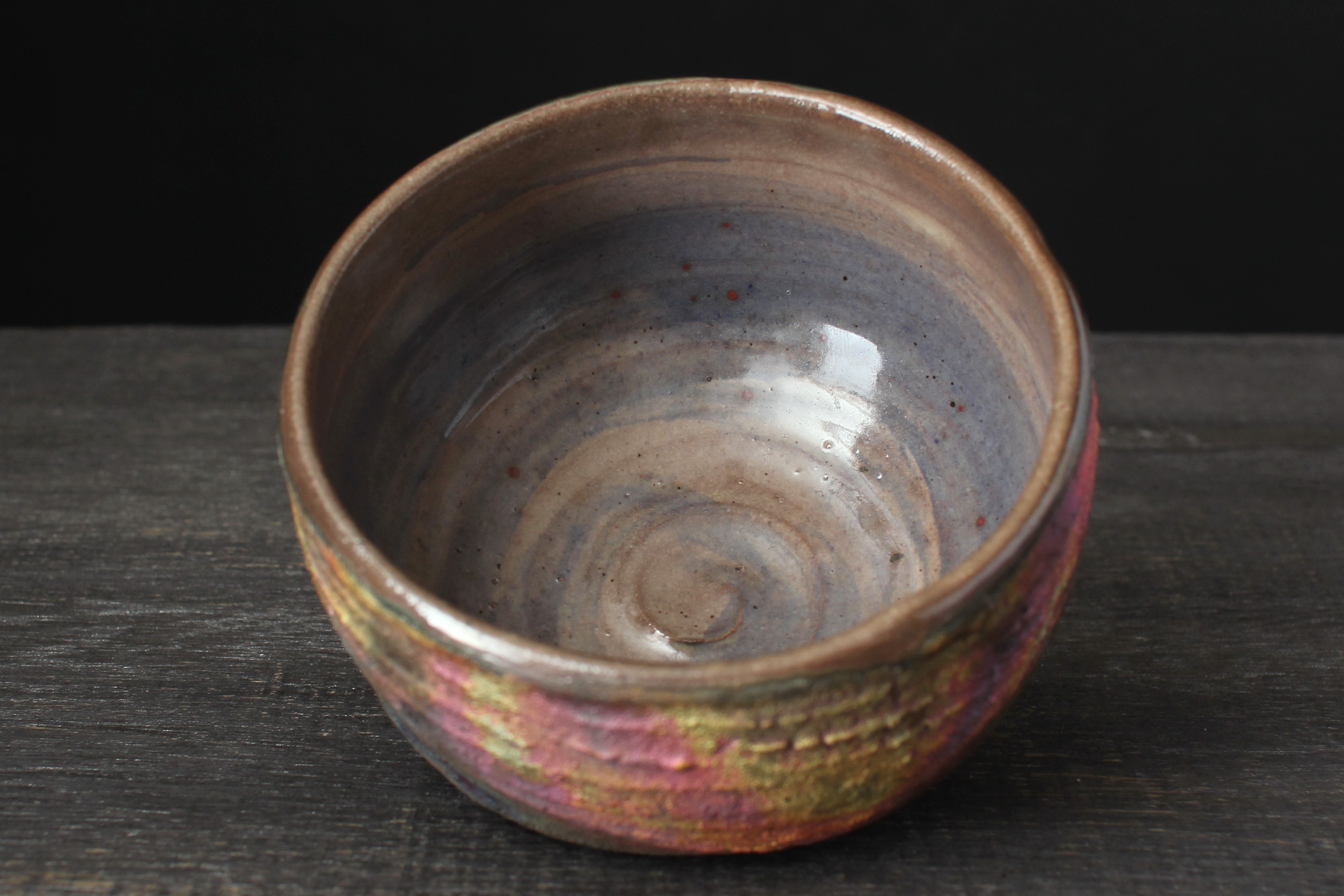 The inside is fully food-safe glazed. The outside and bottom raku copper glaze.